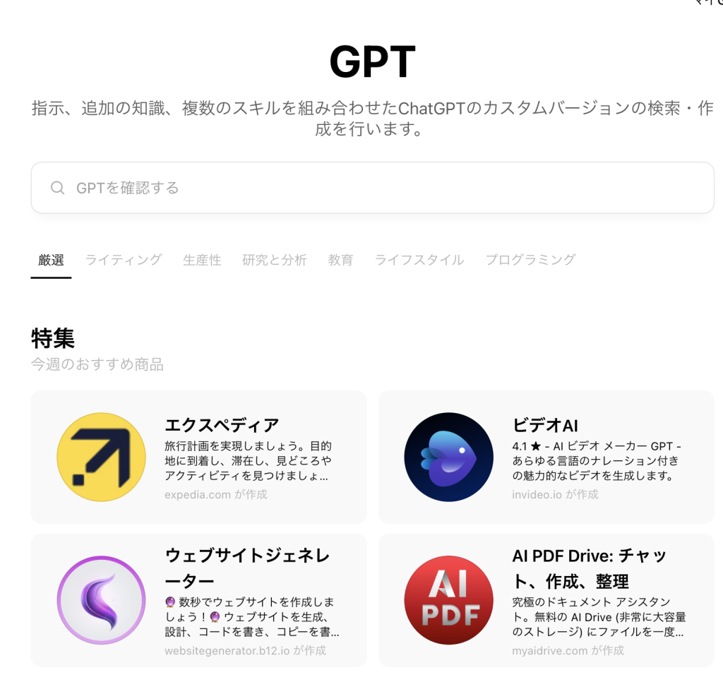 この画面の検索ウィンドウにキーワードを入力すると関連したGPTを検索できます。